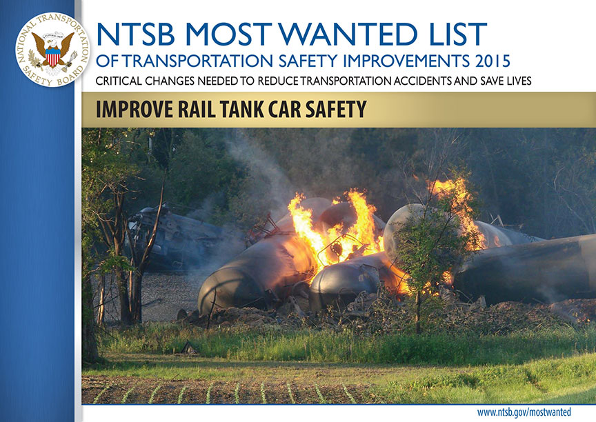 DOT-111 tank cars, the “workhorse” of the industry, are the most common rail tank car in use. The NTSB has identified a number of vulnerabilities in DOT-111 tank car design with respect to tank heads, shells, and fittings. These vulnerabilities create the risk that, in an accident, hazardous materials could be released and, in the case of flammable liquids such as crude oil and ethanol, could ignite and cause catastrophic damage.