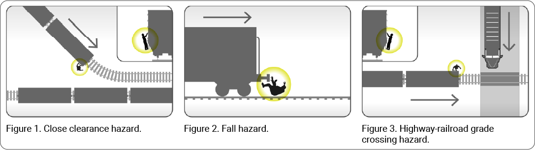 • When riding shoving movements through highway-railroad grade crossings, conductors can be struck by highway motor vehicles. (See figure 3.) This risk is common in industry yards, where highway-railroad grade crossings often lack gates and active warning lights.