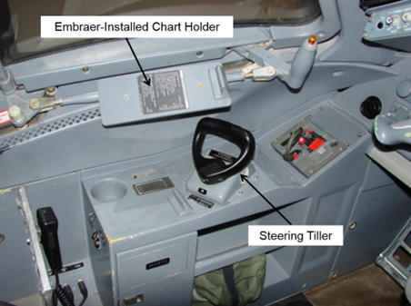 During our investigations, we discovered Embraer pilots were using binder brackets to clip their open navigation chart binders on the Embraer-installed chart holder, which is designed to hold individual charts and located directly above the steering tiller.