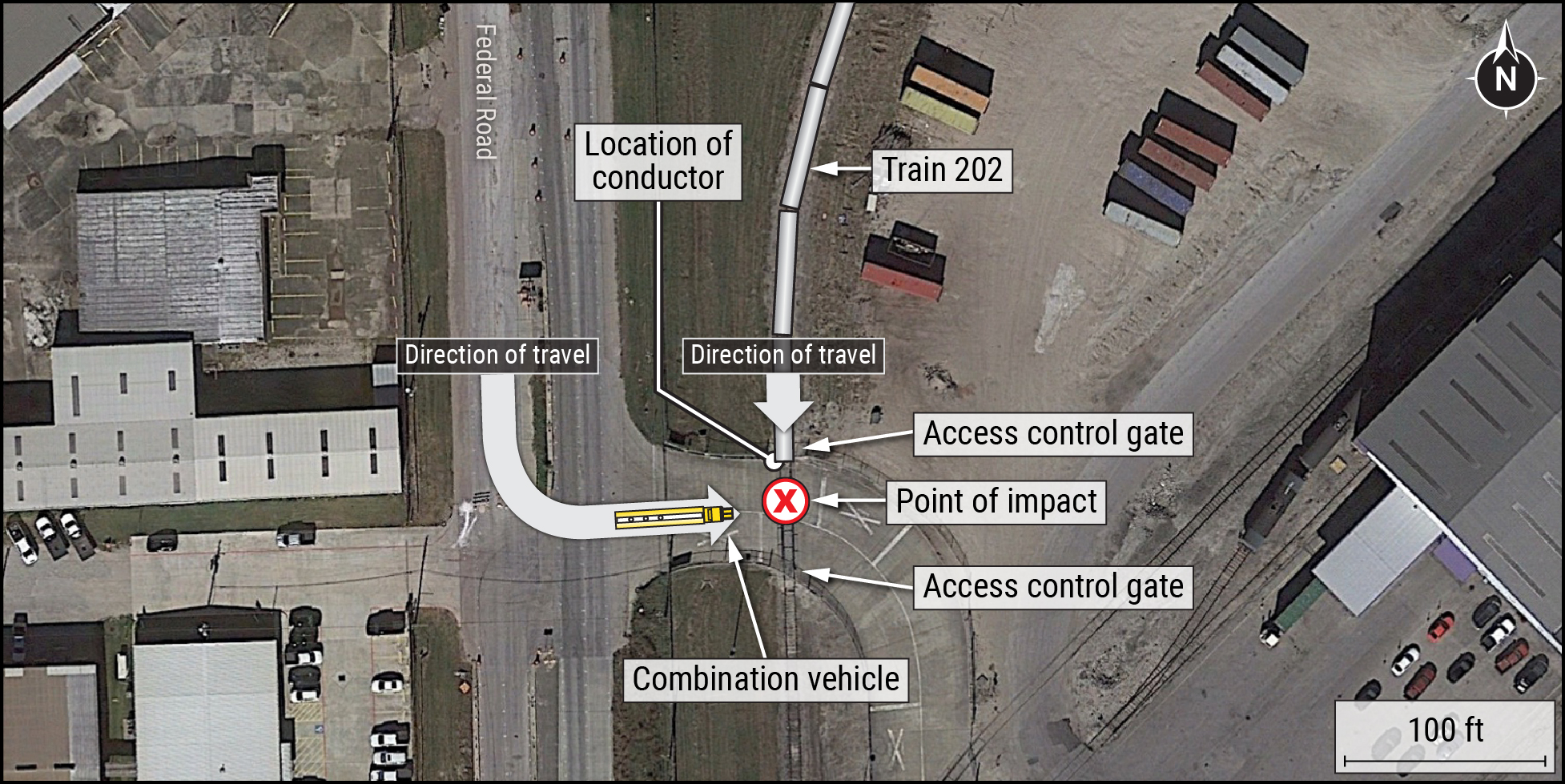 When the conductor’s rail car entered a highway-railroad grade crossing, an 18-wheeler struck it, pinning the conductor between the train and the truck. The grade crossing had warning signs but no mechanical gates to prevent crossing. Our investigation found that the truck driver did not heed the warning signs and failed to stop when entering the grade crossing.
