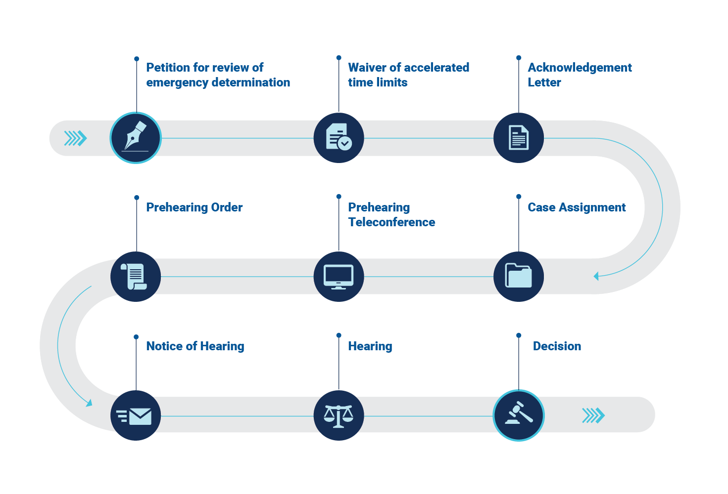 The assigned judge will notify you of the time and date for a Prehearing Teleconference. Points for discussion at the teleconference will be the steps leading up to the hearing.