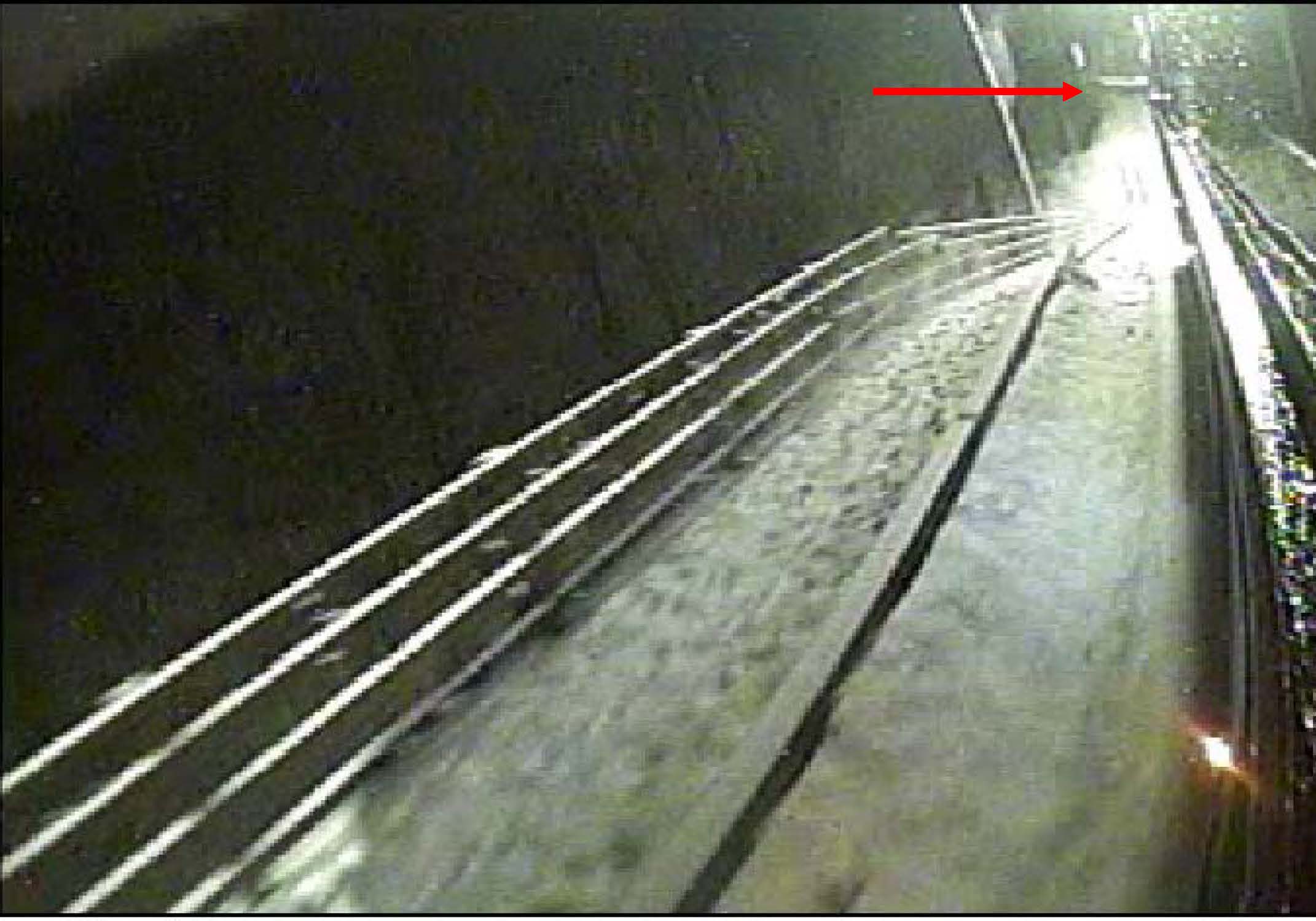 NTSB investigators and investigative party members reviewed video footage from the transit bus’s camera system that provides information on the sequence of the collapse. The forward-facing camera showed the bridge deck separating at the east expansion joint. The curbside camera showed that, at nearly the same time, the west end of the bridge had already fallen off the west abutment.