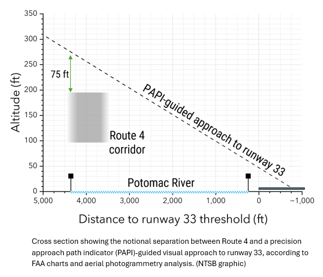 In its 10-page urgent recommendation report, the NTSB said that helicopters transiting the Route 4 helicopter corridor at the maximum authorized altitude of 200 feet could have only about 75 feet of vertical separation from an airplane on landing approach to Runway 33. The NTSB said the lack of separation was insufficient and said vertical separation could potentially be even less than 75 feet depending on the helicopter’s lateral distance from the Potomac River shoreline or if an approaching airplane was below the designated visual glidepath to Runway 33.