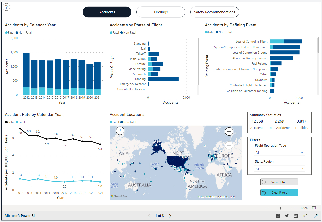 This interactive report provides summary statistics for general aviation accidents occurring from 2012 through 2021, including investigative findings and safety recommendations associated with these accidents.
