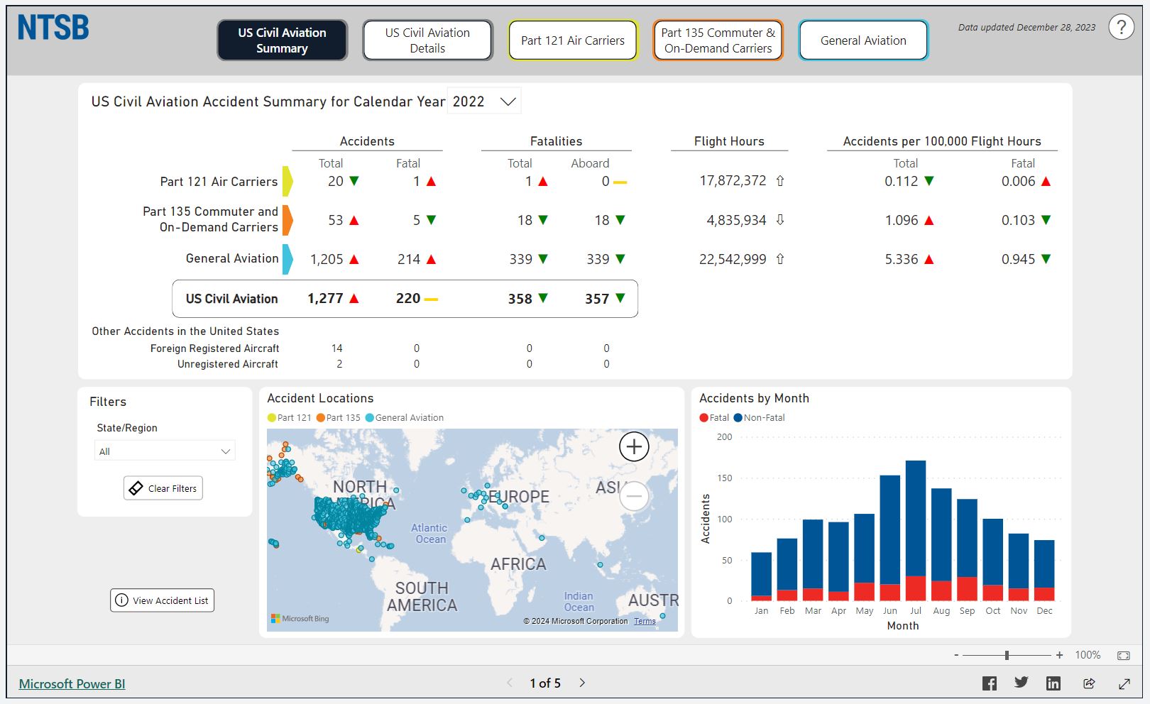 This interactive report is a companion to the accident statistics tables. It provides summary statistics for US civil aviation accidents occurring from 2008 through 2023.