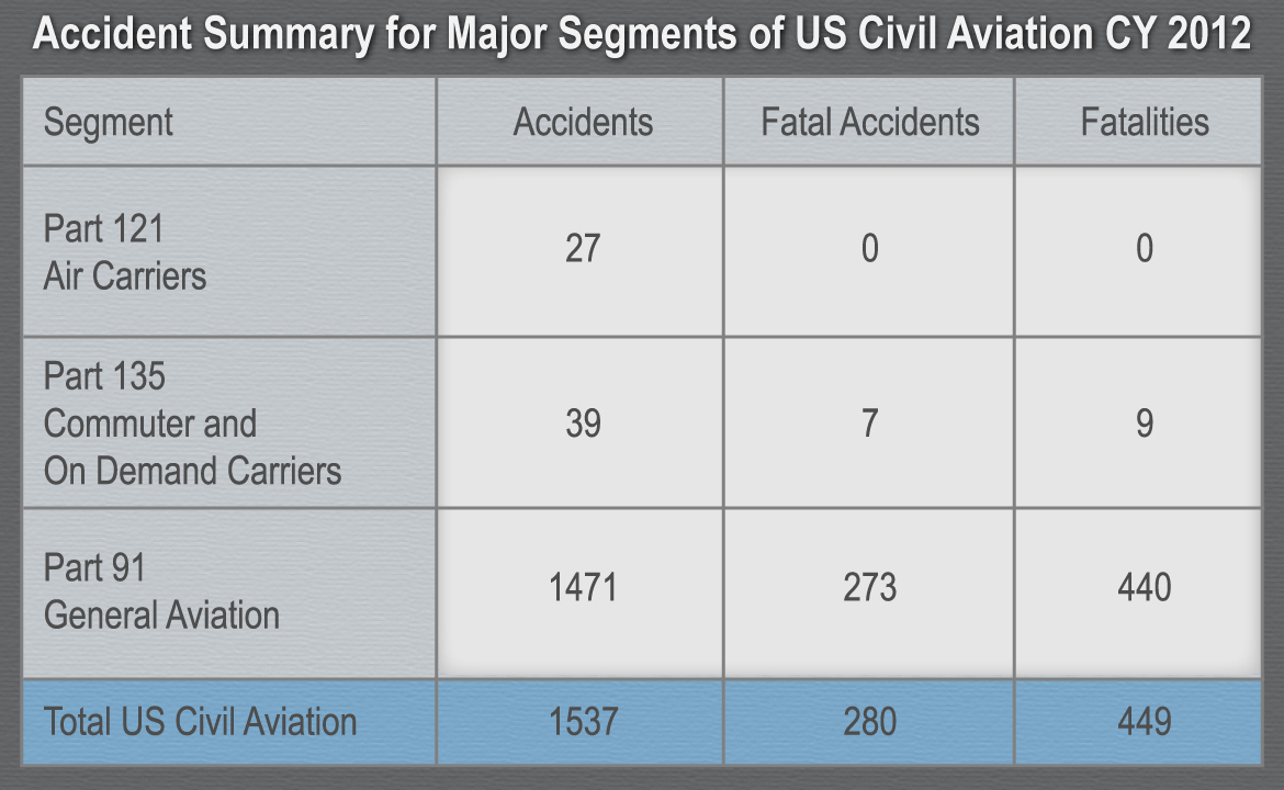 Welcome to the NTSB's Summary of US Civil Aviation Accidents for Calendar Year 2012. This summary combines information on accidents involving air carriers (regulated by Title 14 Code of Federal Regulations [CFR] Part 121), commuter and on-demand carriers (regulated by 14 CFR Part 135) and general aviation (regulated by 14 CFR Part 91).